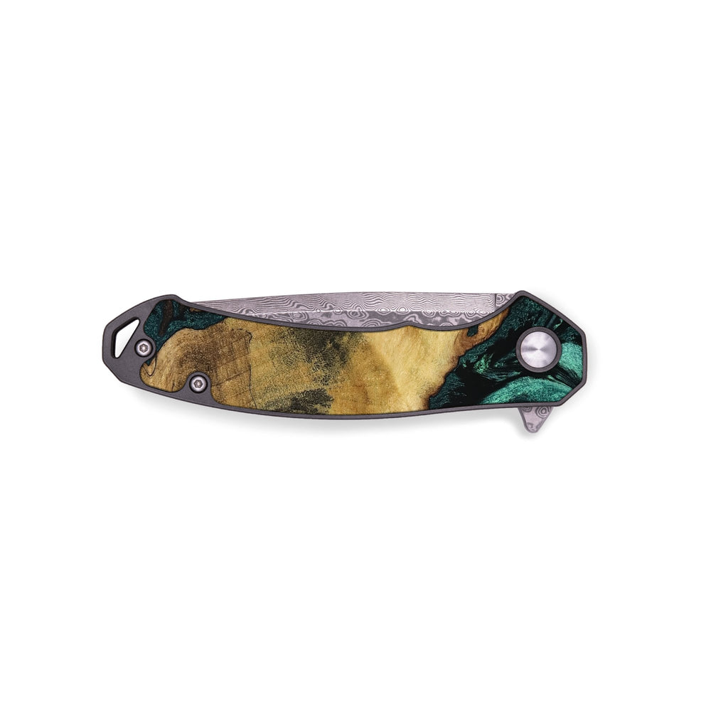 Experience the perfect blend of form and function with our durable folding pocket knife, featuring a lightweight titanium handle. The Damascus stainless steel blade is complemented by a unique wood burl and resin inlay. Imported blade and handle.