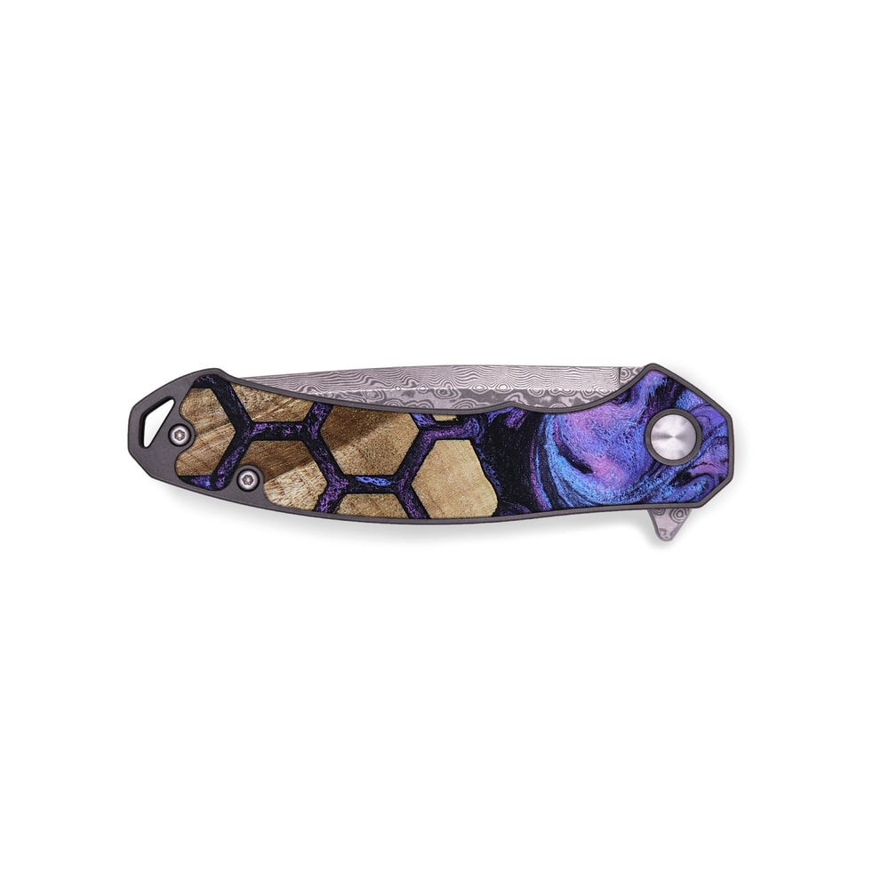Experience the perfect blend of form and function with our durable folding pocket knife, featuring a lightweight titanium handle. The Damascus stainless steel blade is complemented by a unique wood burl and resin inlay. Imported blade and handle.