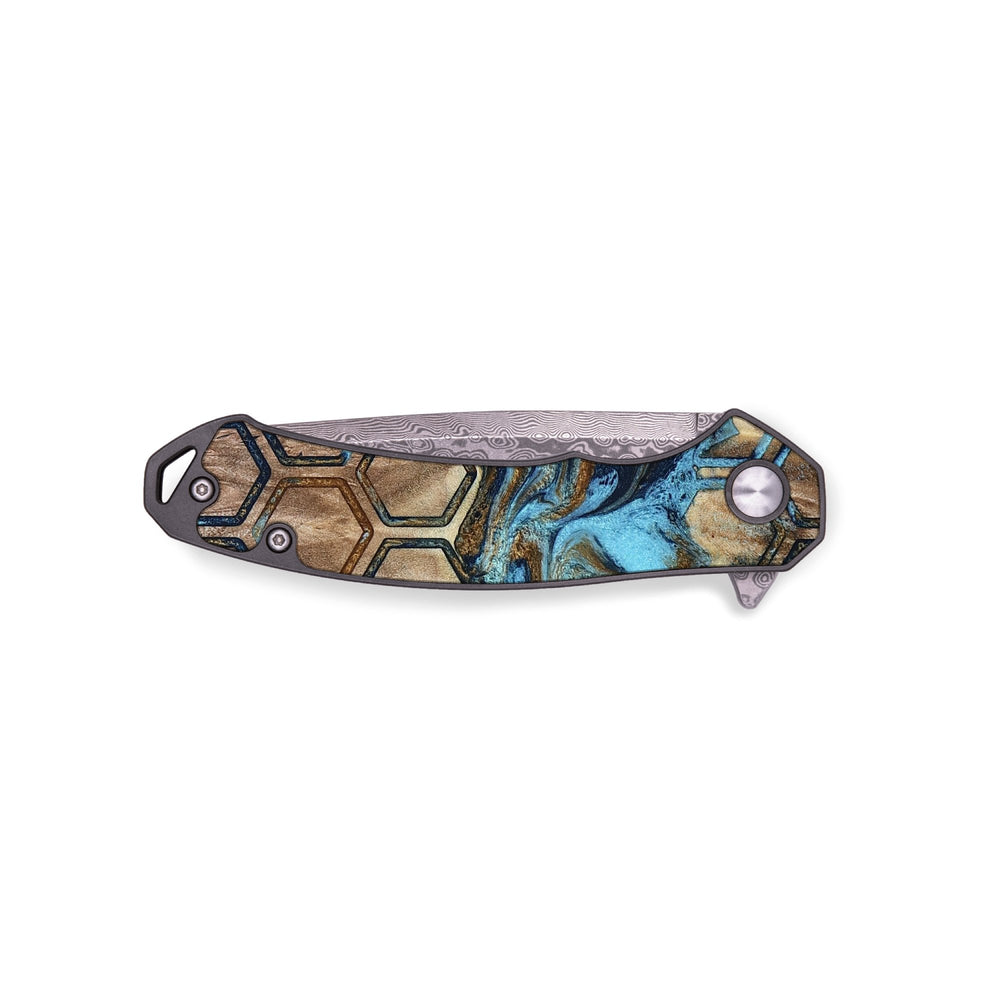 Experience the perfect blend of form and function with our durable folding pocket knife, featuring a lightweight titanium handle. The Damascus stainless steel blade is complemented by a unique wood burl and resin inlay. Imported blade and handle.