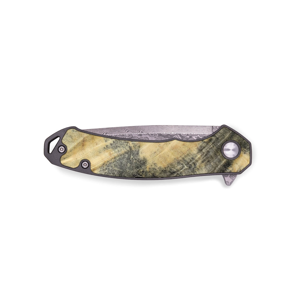 Experience the perfect blend of form and function with our durable folding pocket knife, featuring a lightweight titanium handle. The Damascus stainless steel blade is complemented by a unique wood burl and resin inlay. Imported blade and handle.