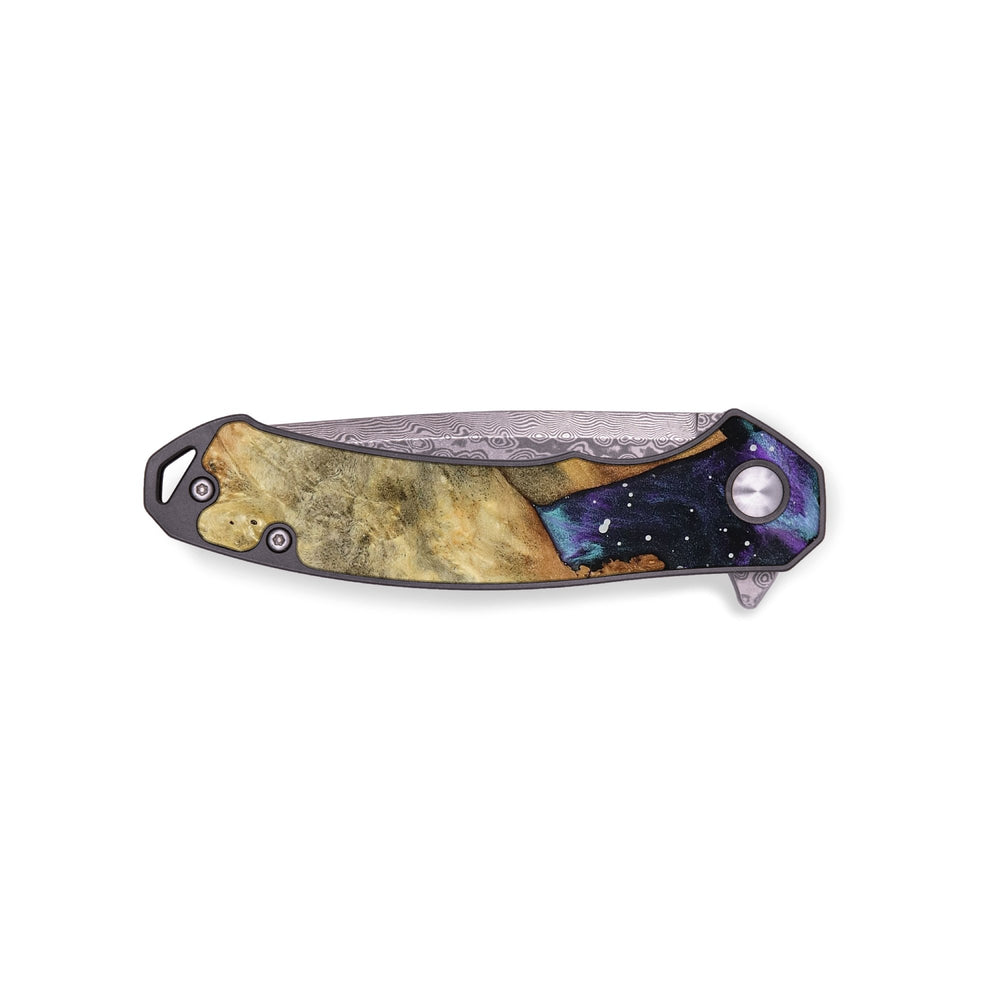 Experience the perfect blend of form and function with our durable folding pocket knife, featuring a lightweight titanium handle. The Damascus stainless steel blade is complemented by a unique wood burl and resin inlay. Imported blade and handle.
