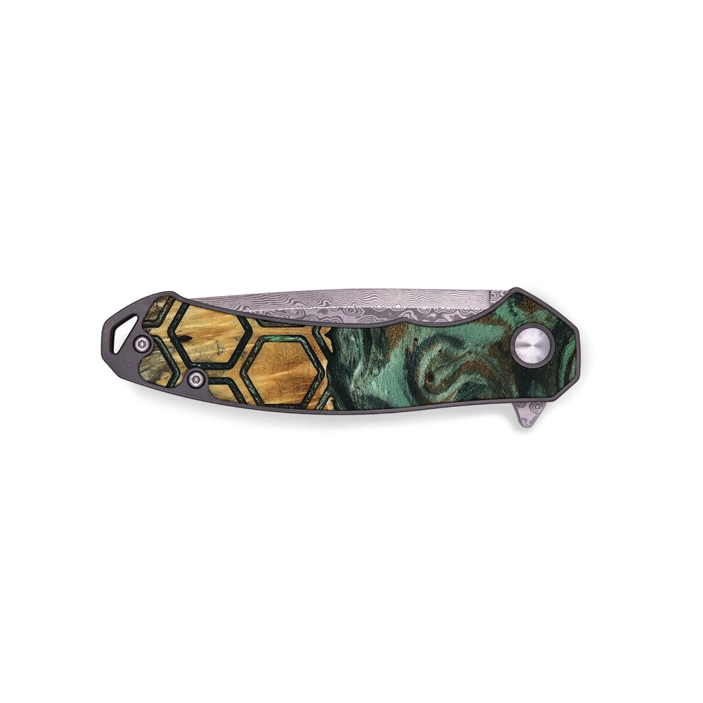 Experience the perfect blend of form and function with our durable folding pocket knife, featuring a lightweight titanium handle. The Damascus stainless steel blade is complemented by a unique wood burl and resin inlay. Imported blade and handle.