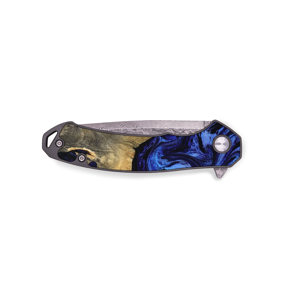 Experience the perfect blend of form and function with our durable folding pocket knife, featuring a lightweight titanium handle. The Damascus stainless steel blade is complemented by a unique wood burl and resin inlay. Imported blade and handle.