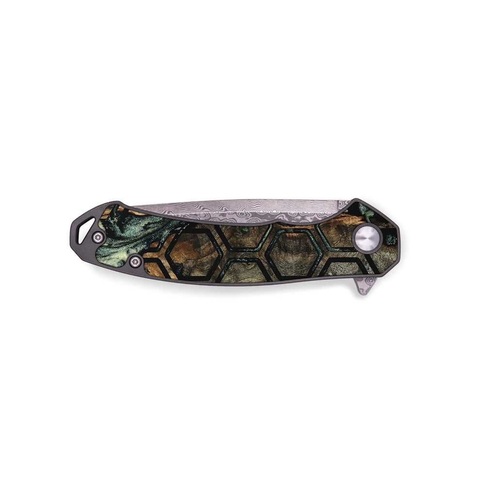 Experience the perfect blend of form and function with our durable folding pocket knife, featuring a lightweight titanium handle. The Damascus stainless steel blade is complemented by a unique wood burl and resin inlay. Imported blade and handle.