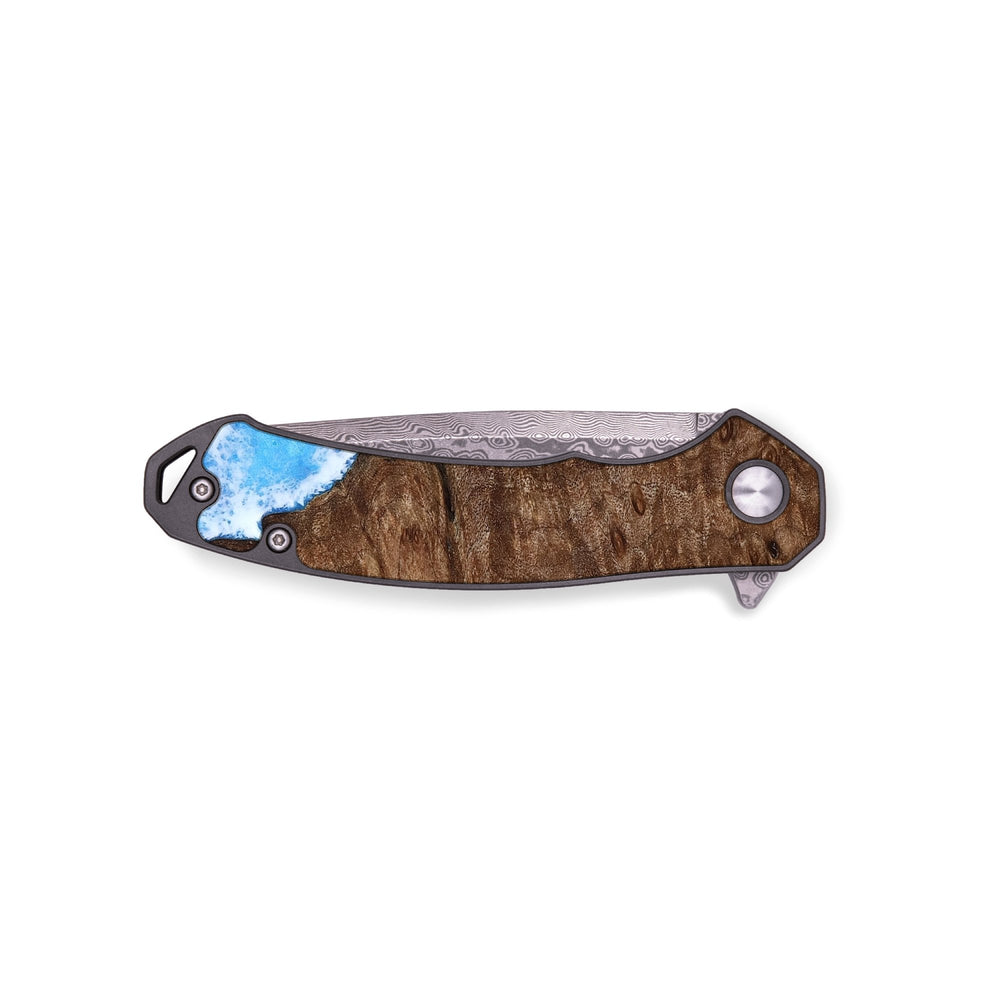 Experience the perfect blend of form and function with our durable folding pocket knife, featuring a lightweight titanium handle. The Damascus stainless steel blade is complemented by a unique wood burl and resin inlay. Imported blade and handle.