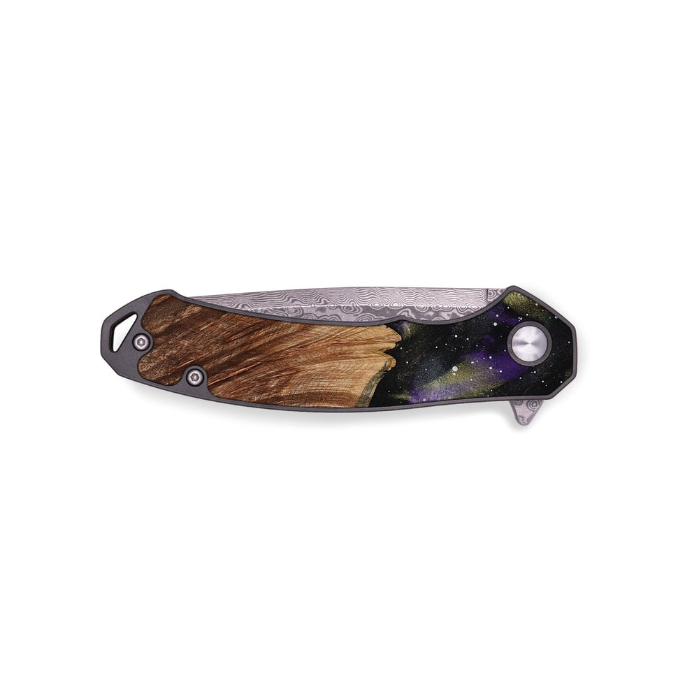 Experience the perfect blend of form and function with our durable folding pocket knife, featuring a lightweight titanium handle. The Damascus stainless steel blade is complemented by a unique wood burl and resin inlay. Imported blade and handle.