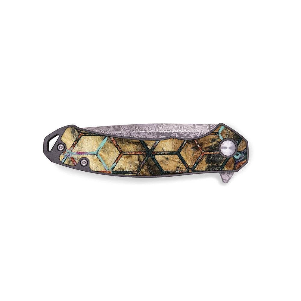 Experience the perfect blend of form and function with our durable folding pocket knife, featuring a lightweight titanium handle. The Damascus stainless steel blade is complemented by a unique wood burl and resin inlay. Imported blade and handle.