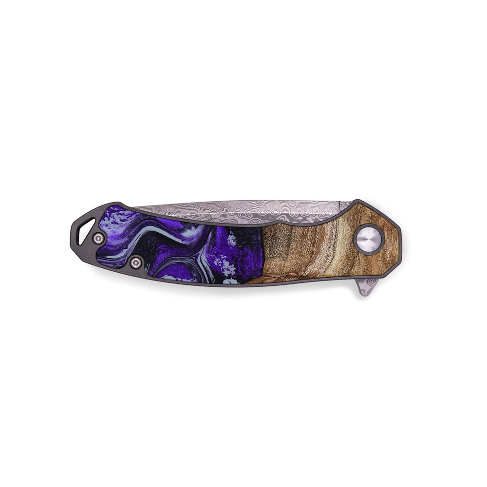 Experience the perfect blend of form and function with our durable folding pocket knife, featuring a lightweight titanium handle. The Damascus stainless steel blade is complemented by a unique wood burl and resin inlay. Imported blade and handle.