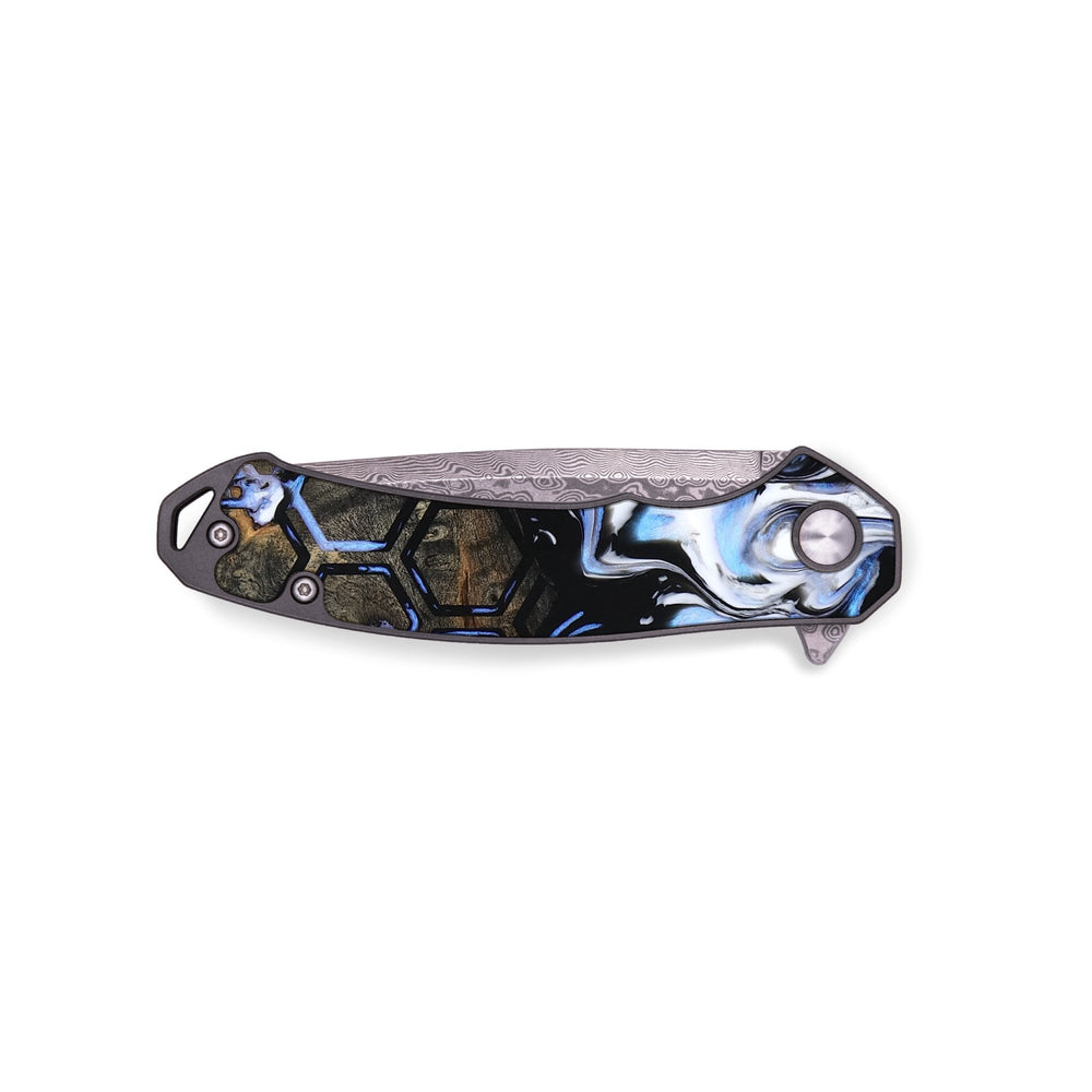 Experience the perfect blend of form and function with our durable folding pocket knife, featuring a lightweight titanium handle. The Damascus stainless steel blade is complemented by a unique wood burl and resin inlay. Imported blade and handle.