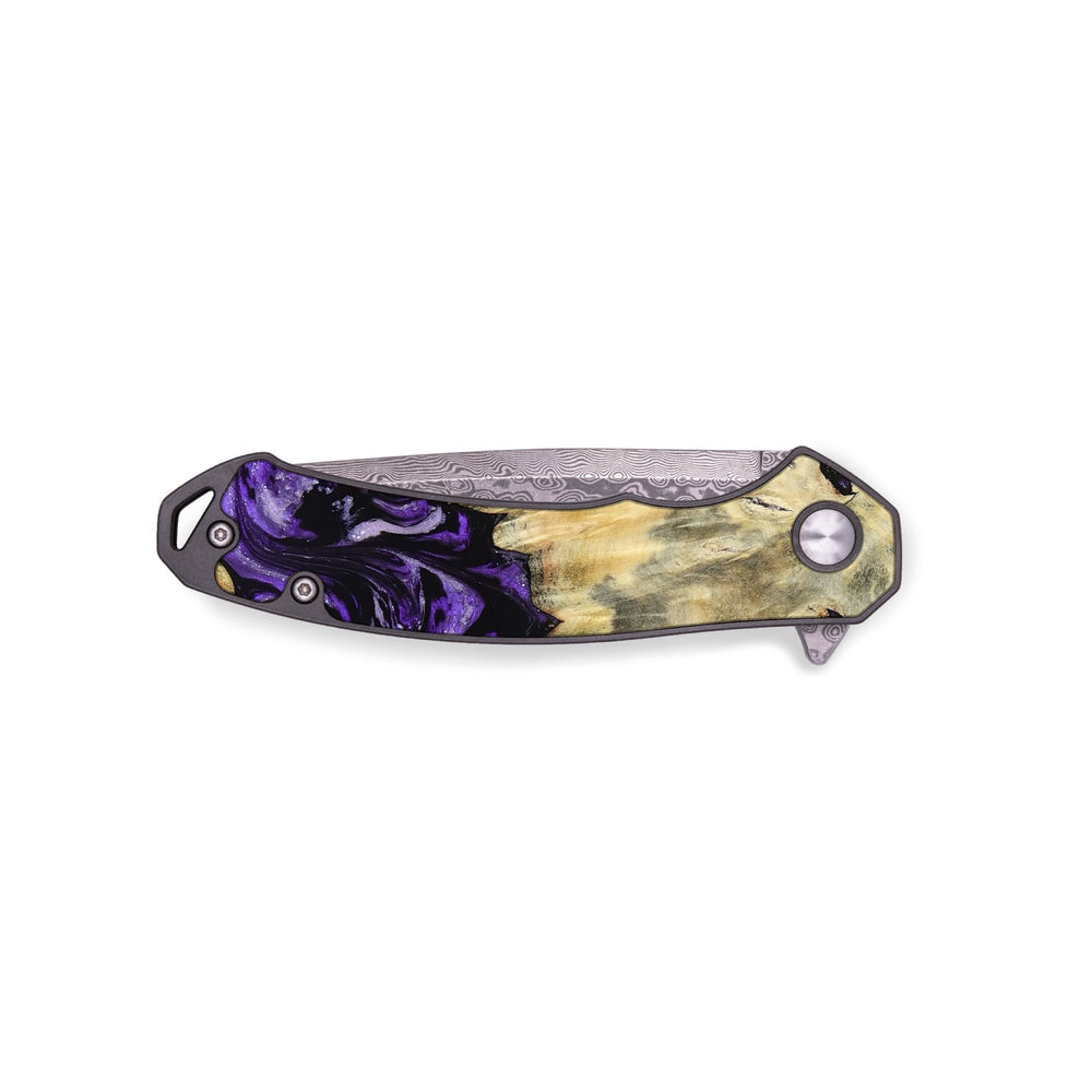 Experience the perfect blend of form and function with our durable folding pocket knife, featuring a lightweight titanium handle. The Damascus stainless steel blade is complemented by a unique wood burl and resin inlay. Imported blade and handle.