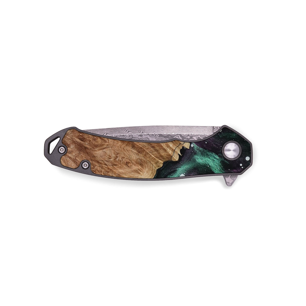 Experience the perfect blend of form and function with our durable folding pocket knife, featuring a lightweight titanium handle. The Damascus stainless steel blade is complemented by a unique wood burl and resin inlay. Imported blade and handle.