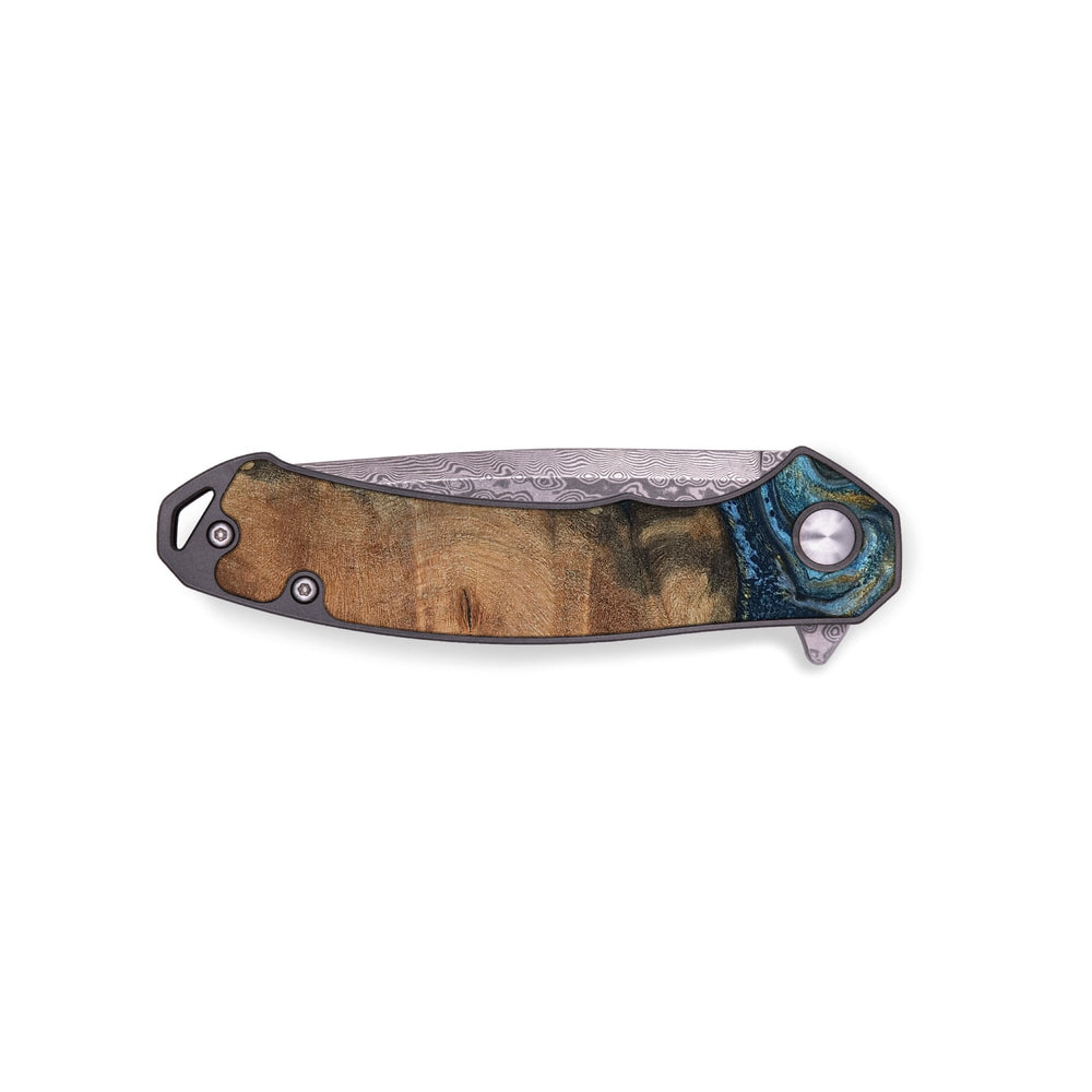 Experience the perfect blend of form and function with our durable folding pocket knife, featuring a lightweight titanium handle. The Damascus stainless steel blade is complemented by a unique wood burl and resin inlay. Imported blade and handle.