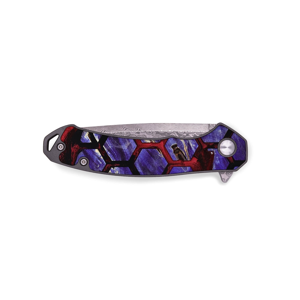 Experience the perfect blend of form and function with our durable folding pocket knife, featuring a lightweight titanium handle. The Damascus stainless steel blade is complemented by a unique wood burl and resin inlay. Imported blade and handle.