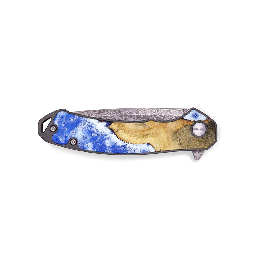 Experience the perfect blend of form and function with our durable folding pocket knife, featuring a lightweight titanium handle. The Damascus stainless steel blade is complemented by a unique wood burl and resin inlay. Imported blade and handle.