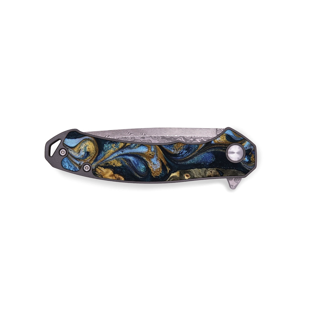 Experience the perfect blend of form and function with our durable folding pocket knife, featuring a lightweight titanium handle. The Damascus stainless steel blade is complemented by a unique wood burl and resin inlay. Imported blade and handle.