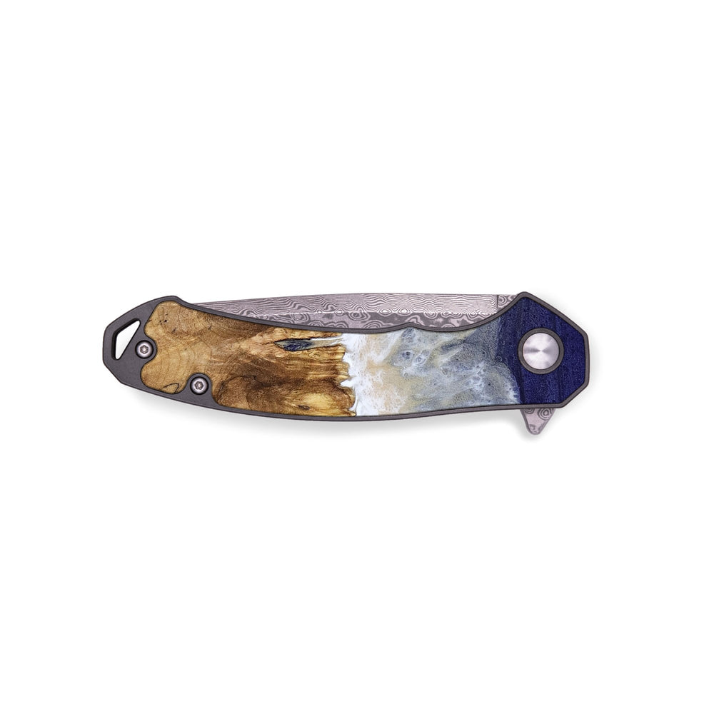 Experience the perfect blend of form and function with our durable folding pocket knife, featuring a lightweight titanium handle. The Damascus stainless steel blade is complemented by a unique wood burl and resin inlay. Imported blade and handle.