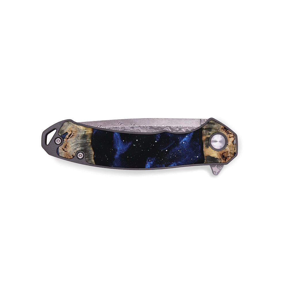 Experience the perfect blend of form and function with our durable folding pocket knife, featuring a lightweight titanium handle. The Damascus stainless steel blade is complemented by a unique wood burl and resin inlay. Imported blade and handle.