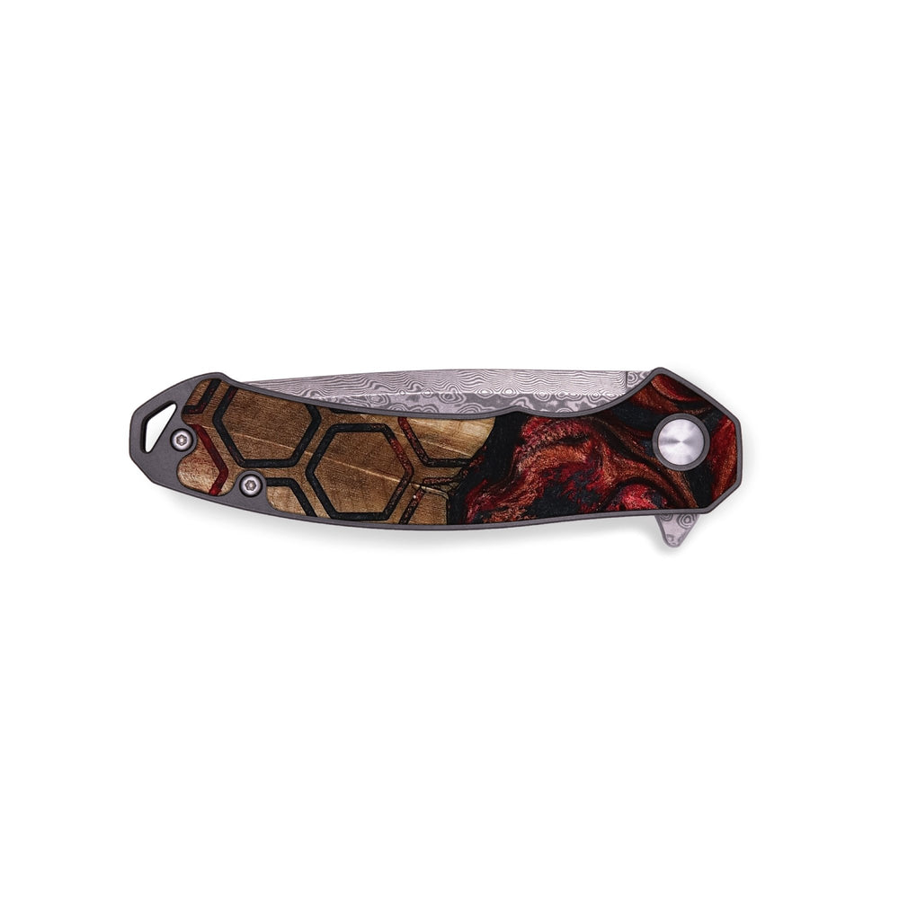 Experience the perfect blend of form and function with our durable folding pocket knife, featuring a lightweight titanium handle. The Damascus stainless steel blade is complemented by a unique wood burl and resin inlay. Imported blade and handle.