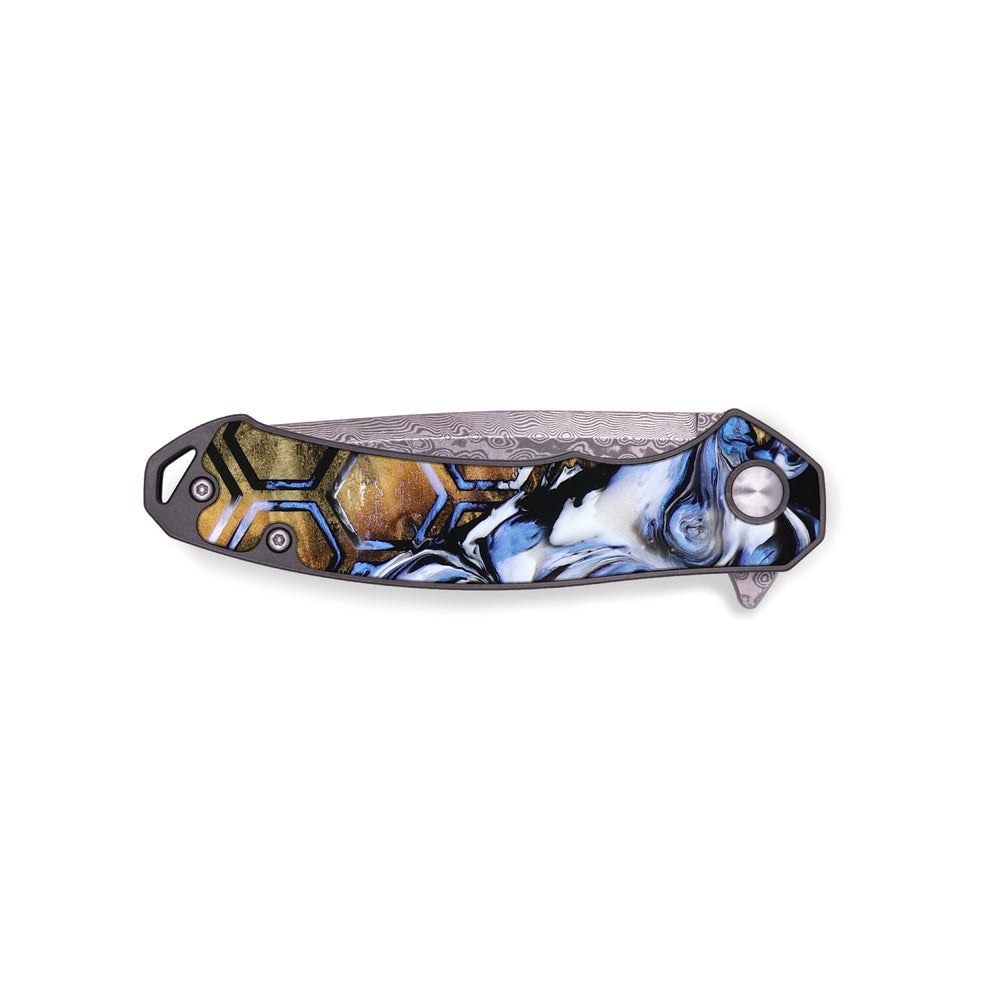 Experience the perfect blend of form and function with our durable folding pocket knife, featuring a lightweight titanium handle. The Damascus stainless steel blade is complemented by a unique wood burl and resin inlay. Imported blade and handle.