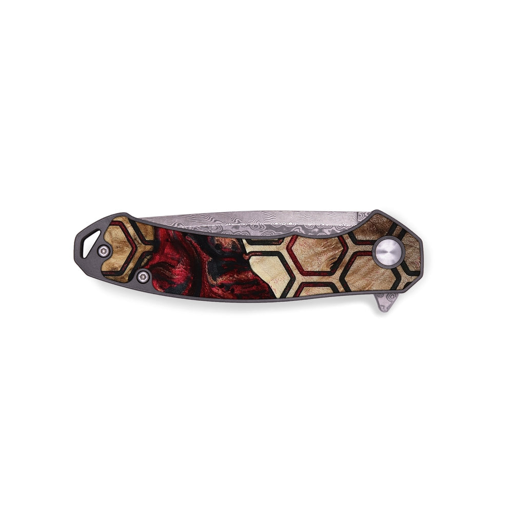 Experience the perfect blend of form and function with our durable folding pocket knife, featuring a lightweight titanium handle. The Damascus stainless steel blade is complemented by a unique wood burl and resin inlay. Imported blade and handle.