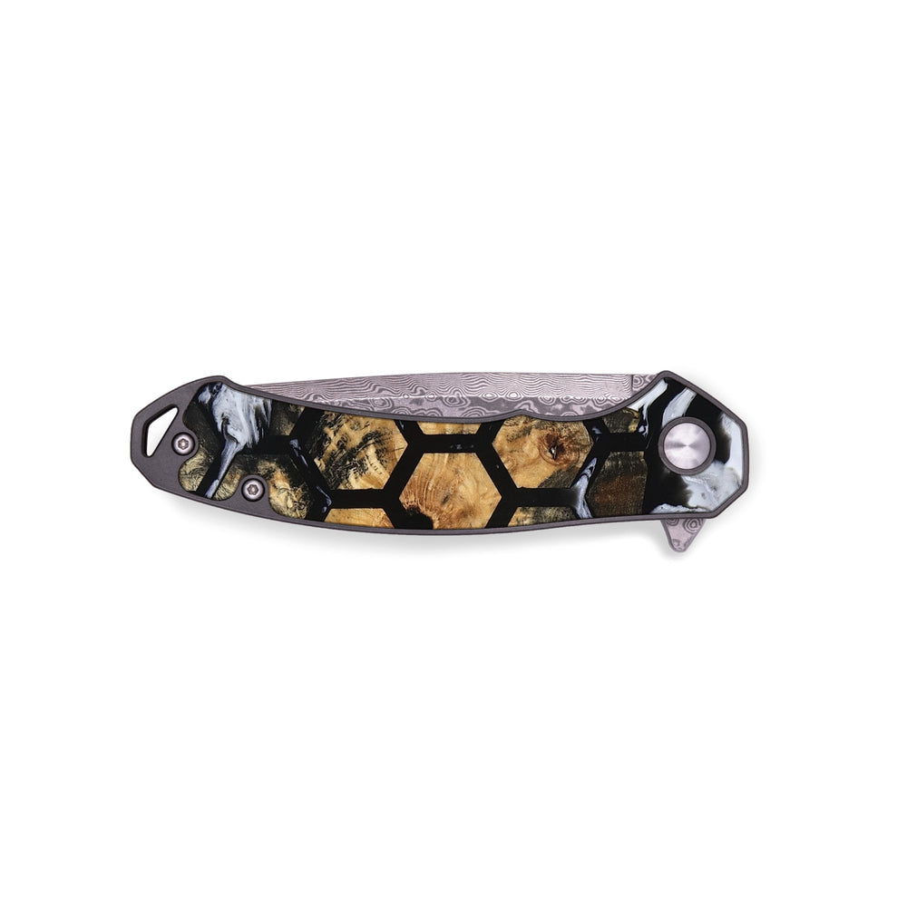 Experience the perfect blend of form and function with our durable folding pocket knife, featuring a lightweight titanium handle. The Damascus stainless steel blade is complemented by a unique wood burl and resin inlay. Imported blade and handle.