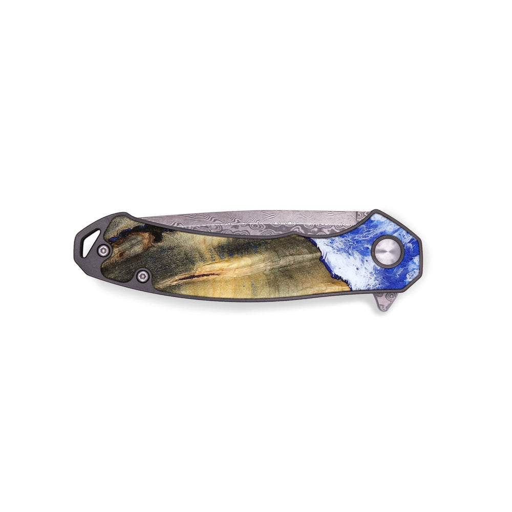 Experience the perfect blend of form and function with our durable folding pocket knife, featuring a lightweight titanium handle. The Damascus stainless steel blade is complemented by a unique wood burl and resin inlay. Imported blade and handle.