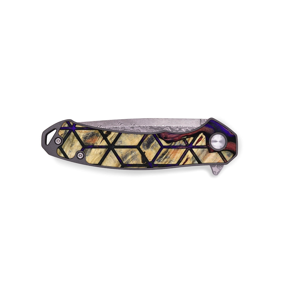Experience the perfect blend of form and function with our durable folding pocket knife, featuring a lightweight titanium handle. The Damascus stainless steel blade is complemented by a unique wood burl and resin inlay. Imported blade and handle.