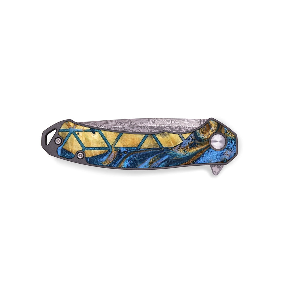 Experience the perfect blend of form and function with our durable folding pocket knife, featuring a lightweight titanium handle. The Damascus stainless steel blade is complemented by a unique wood burl and resin inlay. Imported blade and handle.