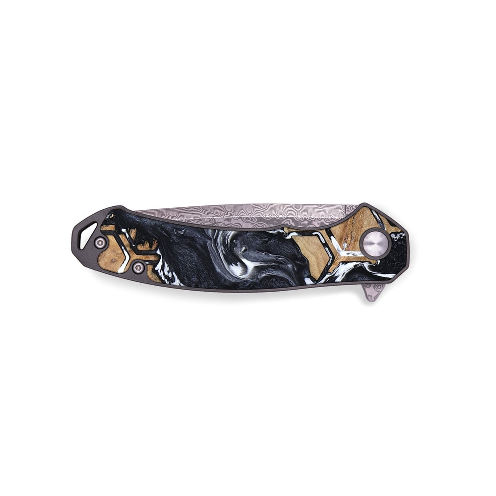Experience the perfect blend of form and function with our durable folding pocket knife, featuring a lightweight titanium handle. The Damascus stainless steel blade is complemented by a unique wood burl and resin inlay. Imported blade and handle.