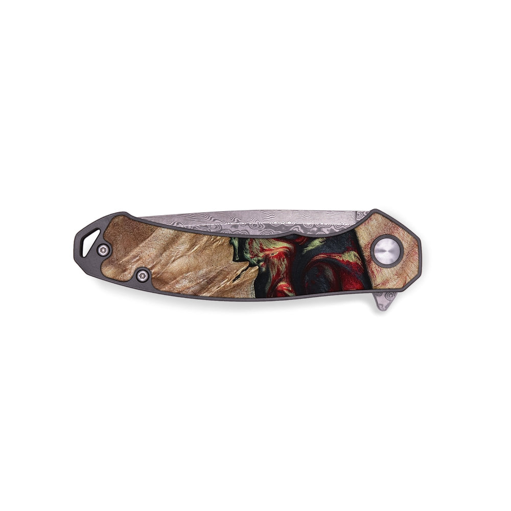 Experience the perfect blend of form and function with our durable folding pocket knife, featuring a lightweight titanium handle. The Damascus stainless steel blade is complemented by a unique wood burl and resin inlay. Imported blade and handle.