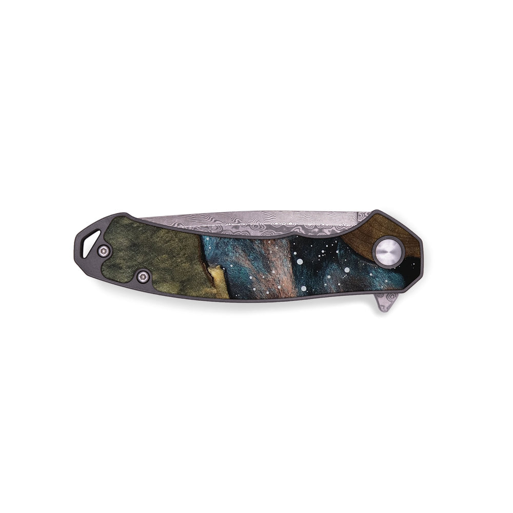 Experience the perfect blend of form and function with our durable folding pocket knife, featuring a lightweight titanium handle. The Damascus stainless steel blade is complemented by a unique wood burl and resin inlay. Imported blade and handle.