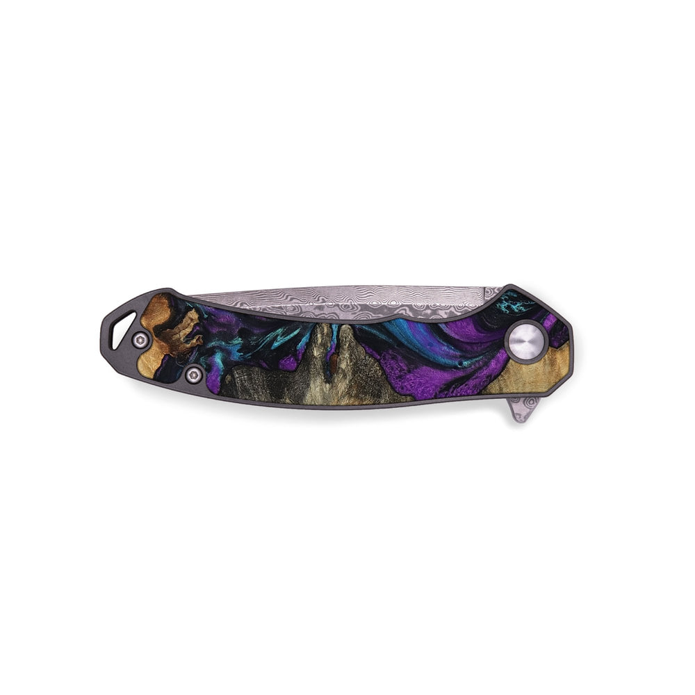 Experience the perfect blend of form and function with our durable folding pocket knife, featuring a lightweight titanium handle. The Damascus stainless steel blade is complemented by a unique wood burl and resin inlay. Imported blade and handle.