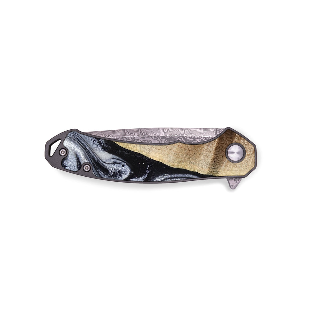 Experience the perfect blend of form and function with our durable folding pocket knife, featuring a lightweight titanium handle. The Damascus stainless steel blade is complemented by a unique wood burl and resin inlay. Imported blade and handle.