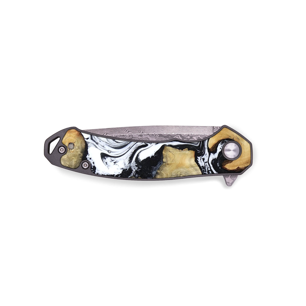 Experience the perfect blend of form and function with our durable folding pocket knife, featuring a lightweight titanium handle. The Damascus stainless steel blade is complemented by a unique wood burl and resin inlay. Imported blade and handle.