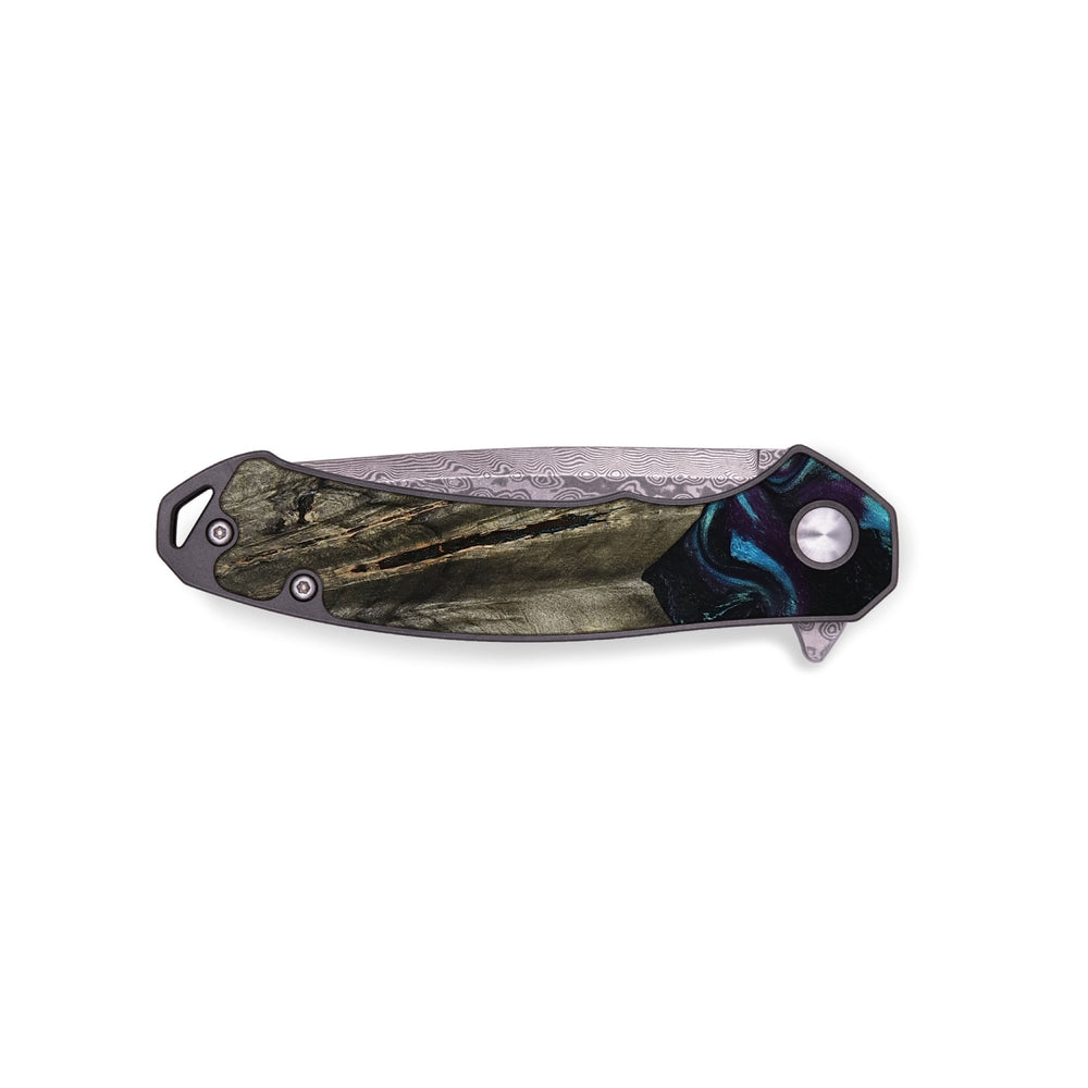 Experience the perfect blend of form and function with our durable folding pocket knife, featuring a lightweight titanium handle. The Damascus stainless steel blade is complemented by a unique wood burl and resin inlay. Imported blade and handle.