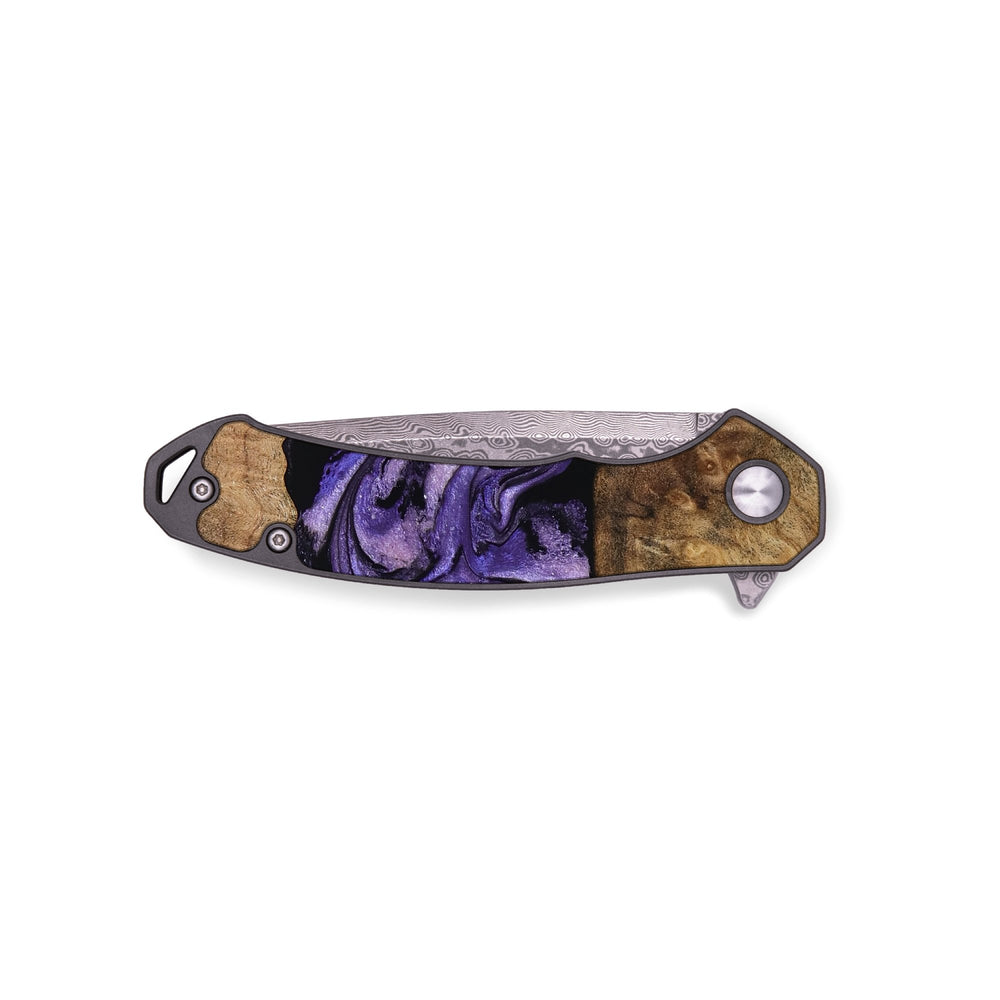 Experience the perfect blend of form and function with our durable folding pocket knife, featuring a lightweight titanium handle. The Damascus stainless steel blade is complemented by a unique wood burl and resin inlay. Imported blade and handle.