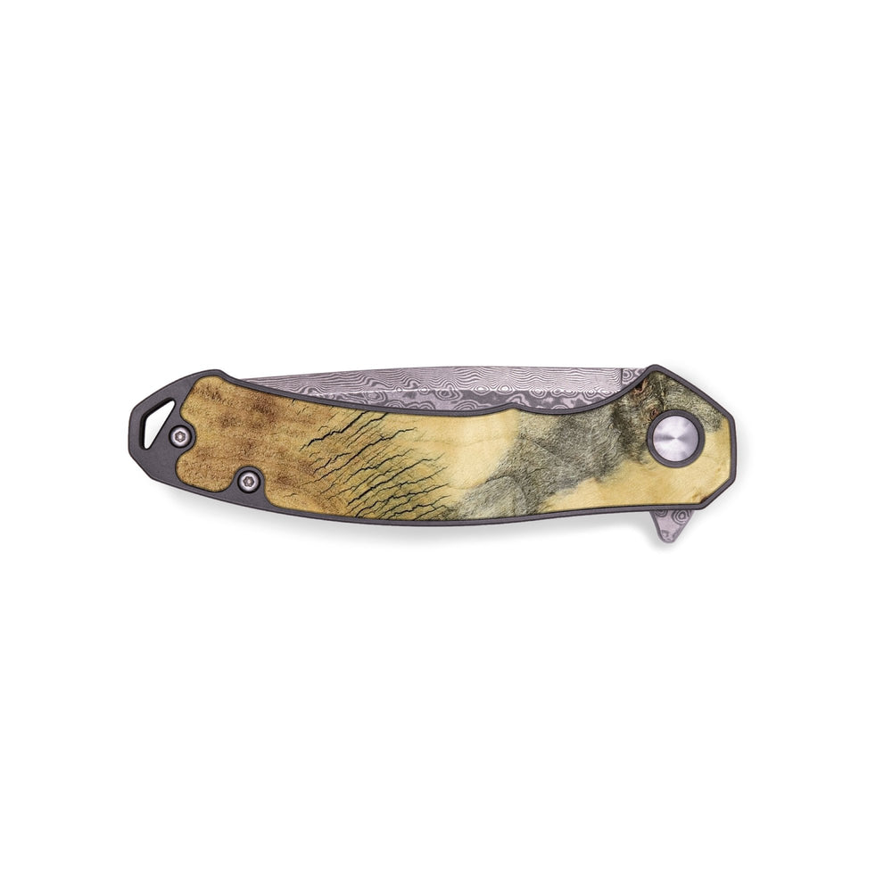 Experience the perfect blend of form and function with our durable folding pocket knife, featuring a lightweight titanium handle. The Damascus stainless steel blade is complemented by a unique wood burl and resin inlay. Imported blade and handle.