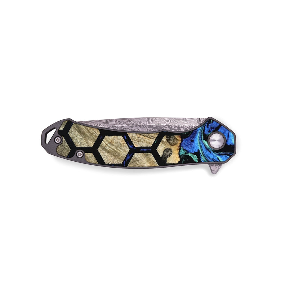Experience the perfect blend of form and function with our durable folding pocket knife, featuring a lightweight titanium handle. The Damascus stainless steel blade is complemented by a unique wood burl and resin inlay. Imported blade and handle.