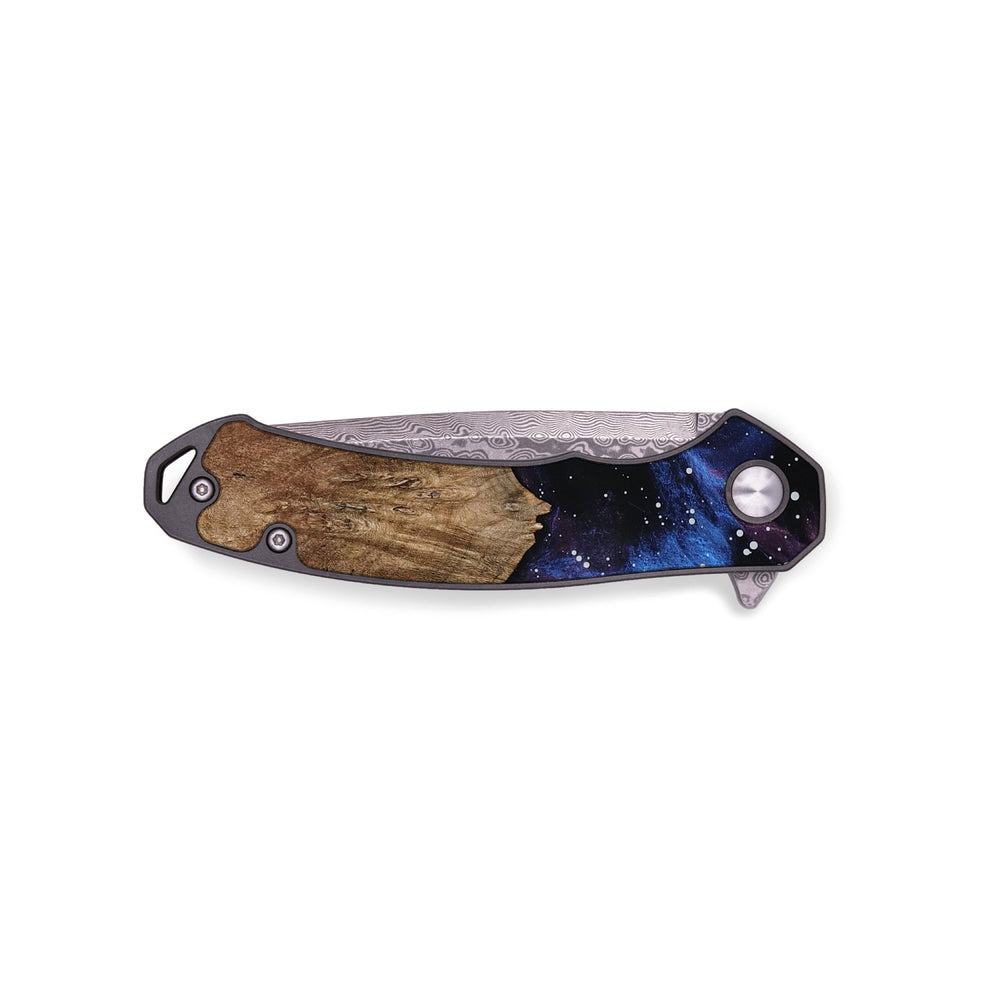 Experience the perfect blend of form and function with our durable folding pocket knife, featuring a lightweight titanium handle. The Damascus stainless steel blade is complemented by a unique wood burl and resin inlay. Imported blade and handle.