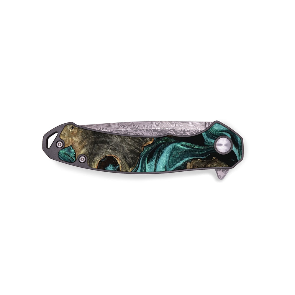 Experience the perfect blend of form and function with our durable folding pocket knife, featuring a lightweight titanium handle. The Damascus stainless steel blade is complemented by a unique wood burl and resin inlay. Imported blade and handle.