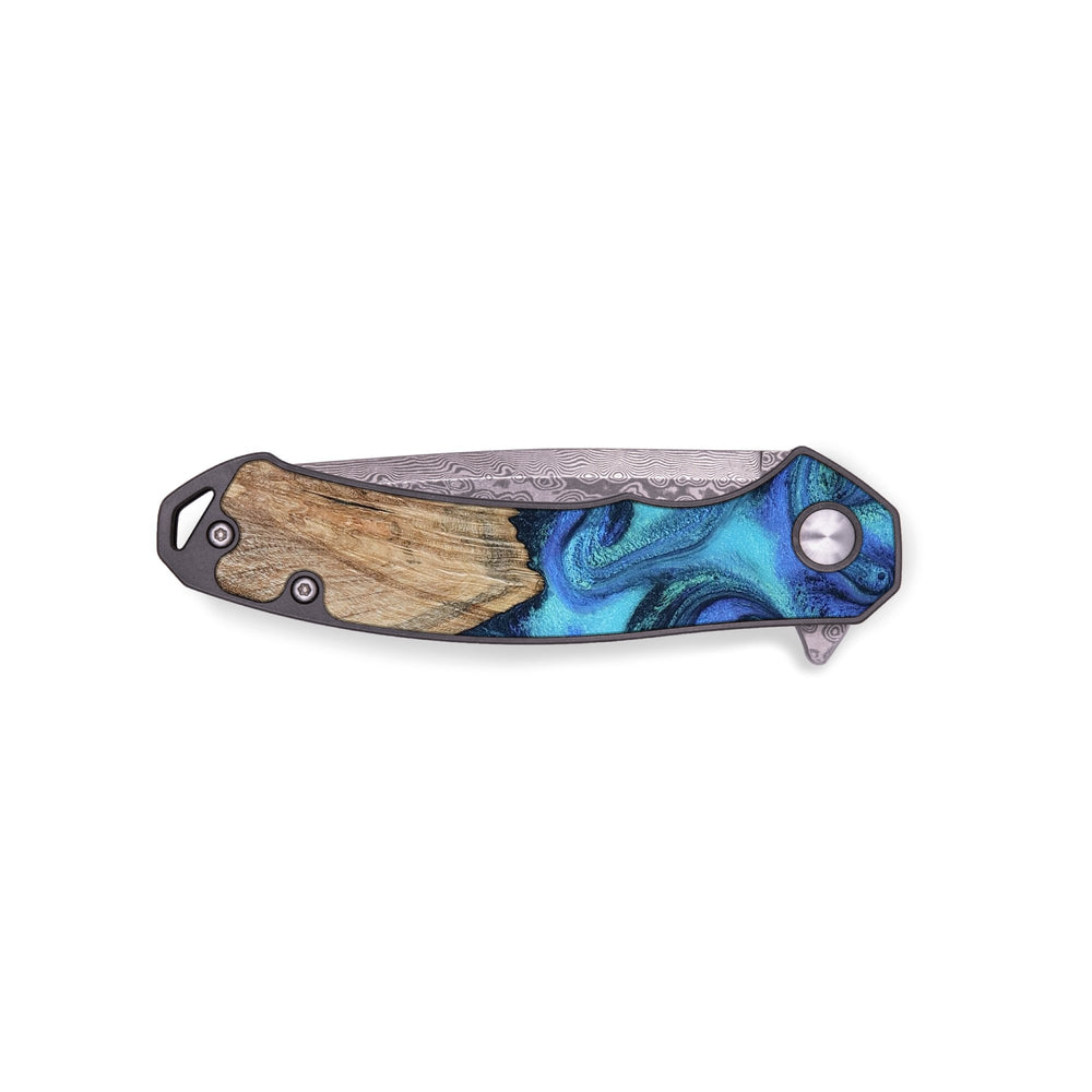 Experience the perfect blend of form and function with our durable folding pocket knife, featuring a lightweight titanium handle. The Damascus stainless steel blade is complemented by a unique wood burl and resin inlay. Imported blade and handle.