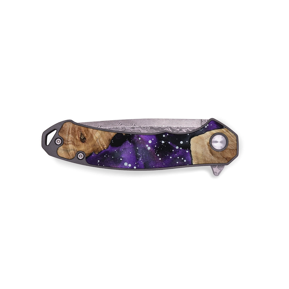 Experience the perfect blend of form and function with our durable folding pocket knife, featuring a lightweight titanium handle. The Damascus stainless steel blade is complemented by a unique wood burl and resin inlay. Imported blade and handle.