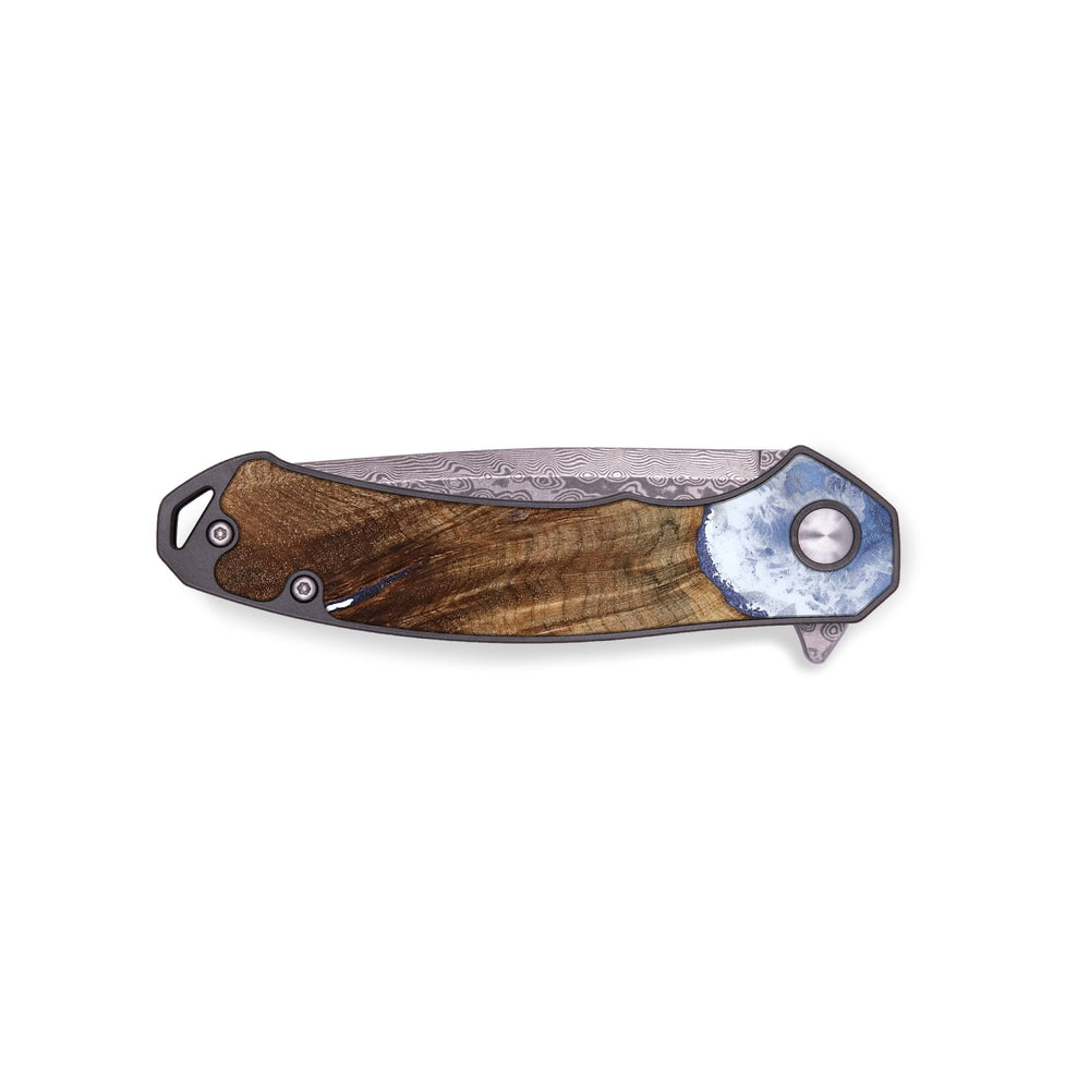 Experience the perfect blend of form and function with our durable folding pocket knife, featuring a lightweight titanium handle. The Damascus stainless steel blade is complemented by a unique wood burl and resin inlay. Imported blade and handle.