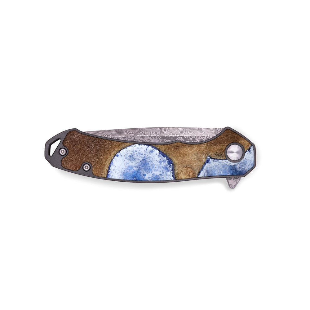 Experience the perfect blend of form and function with our durable folding pocket knife, featuring a lightweight titanium handle. The Damascus stainless steel blade is complemented by a unique wood burl and resin inlay. Imported blade and handle.