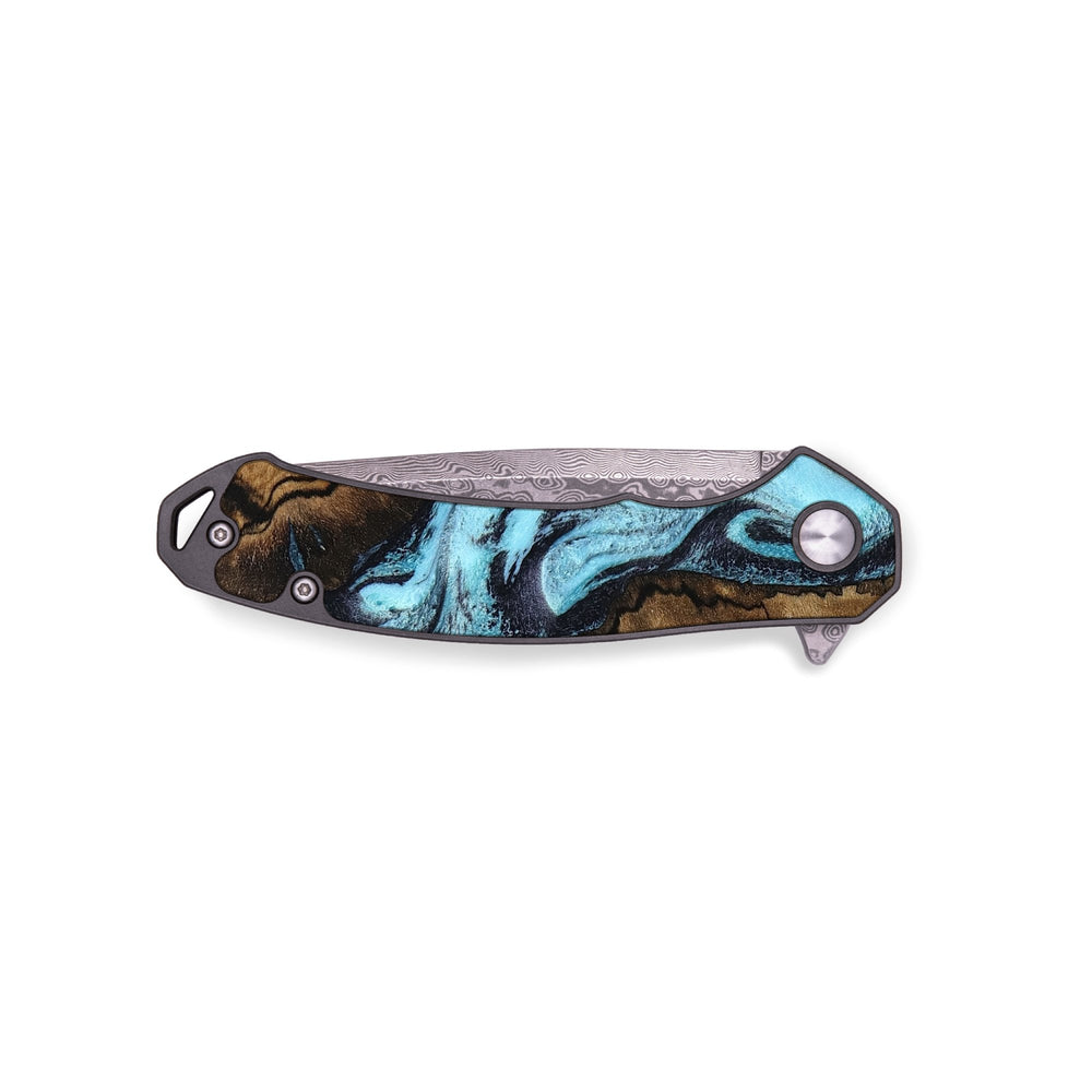 Experience the perfect blend of form and function with our durable folding pocket knife, featuring a lightweight titanium handle. The Damascus stainless steel blade is complemented by a unique wood burl and resin inlay. Imported blade and handle.