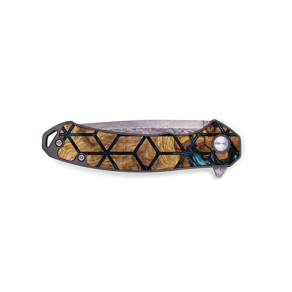 Experience the perfect blend of form and function with our durable folding pocket knife, featuring a lightweight titanium handle. The Damascus stainless steel blade is complemented by a unique wood burl and resin inlay. Imported blade and handle.