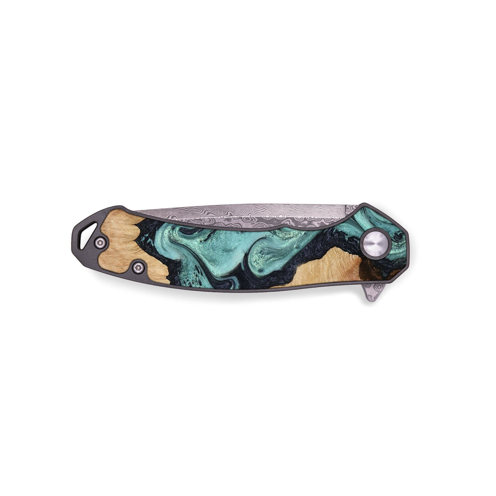 Experience the perfect blend of form and function with our durable folding pocket knife, featuring a lightweight titanium handle. The Damascus stainless steel blade is complemented by a unique wood burl and resin inlay. Imported blade and handle.