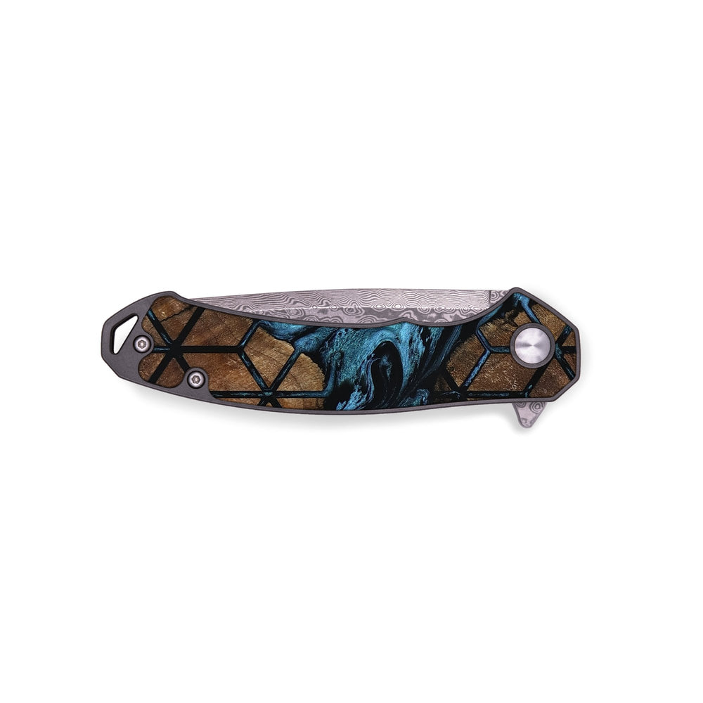Experience the perfect blend of form and function with our durable folding pocket knife, featuring a lightweight titanium handle. The Damascus stainless steel blade is complemented by a unique wood burl and resin inlay. Imported blade and handle.