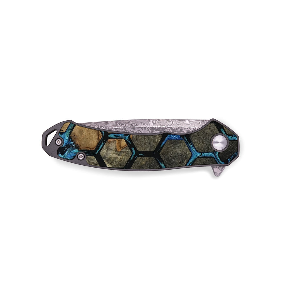 Experience the perfect blend of form and function with our durable folding pocket knife, featuring a lightweight titanium handle. The Damascus stainless steel blade is complemented by a unique wood burl and resin inlay. Imported blade and handle.