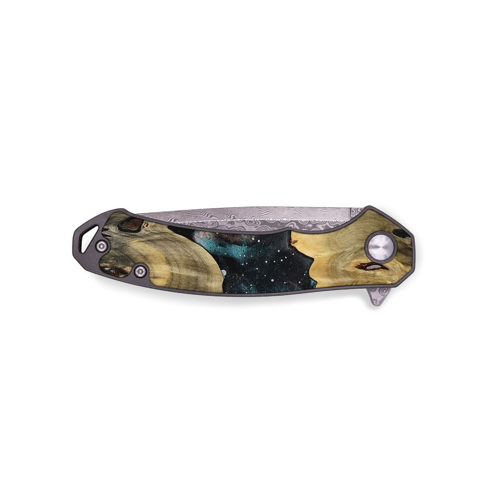 Experience the perfect blend of form and function with our durable folding pocket knife, featuring a lightweight titanium handle. The Damascus stainless steel blade is complemented by a unique wood burl and resin inlay. Imported blade and handle.